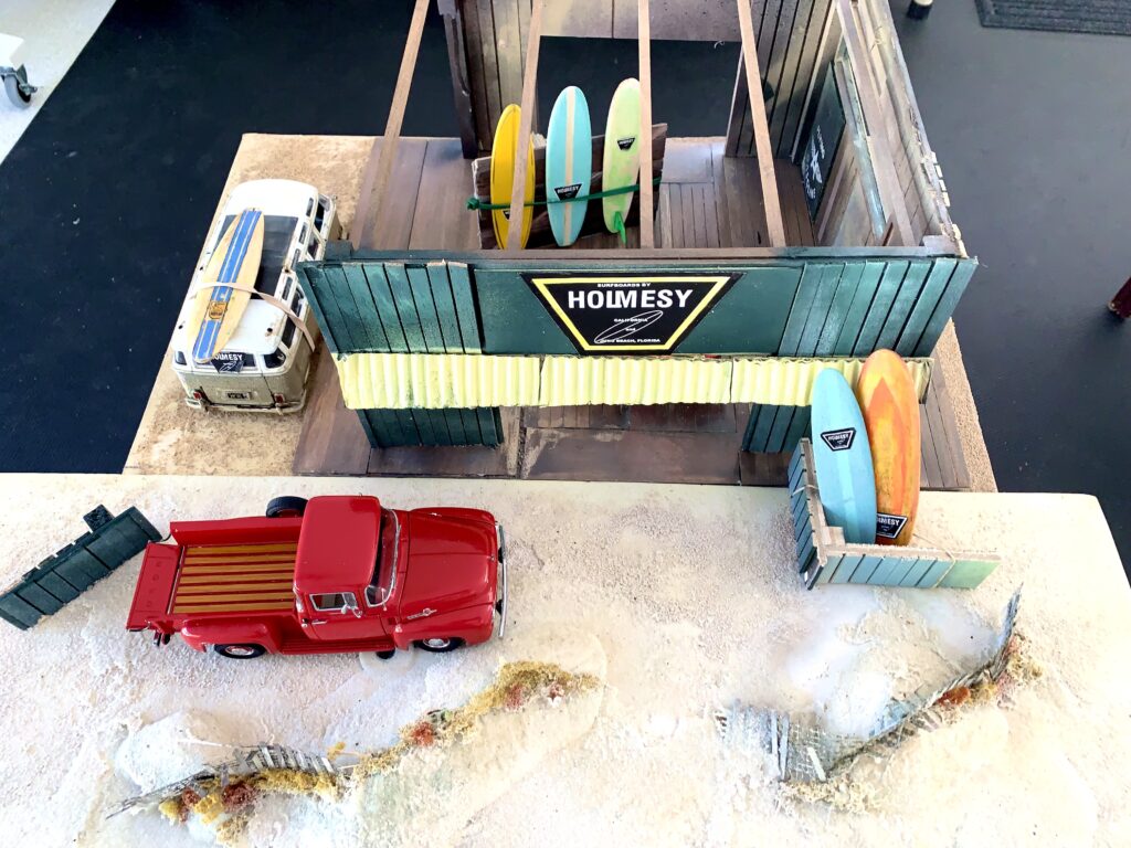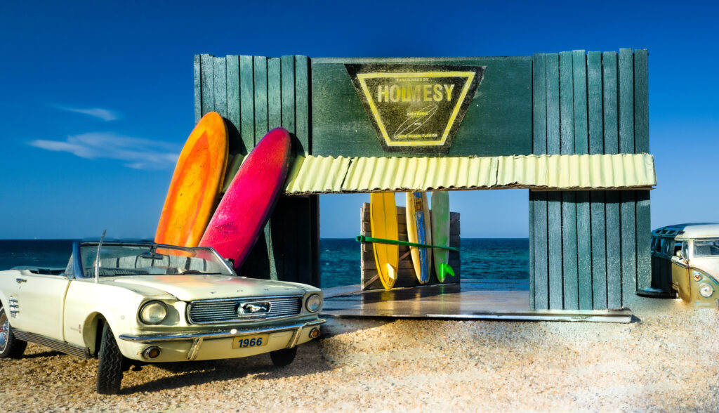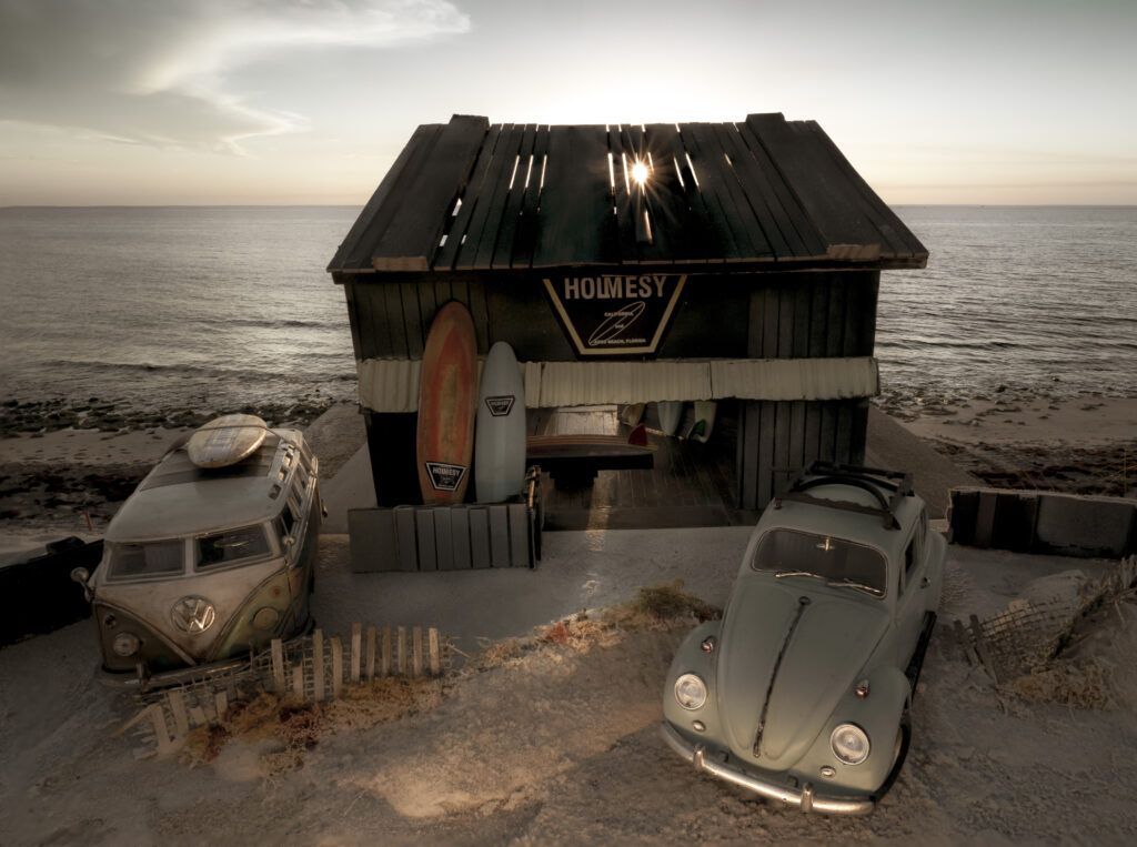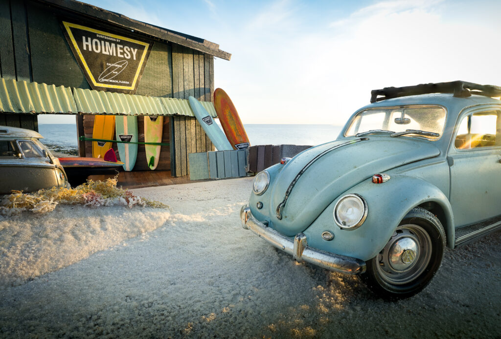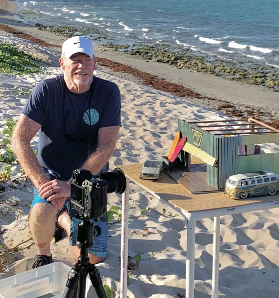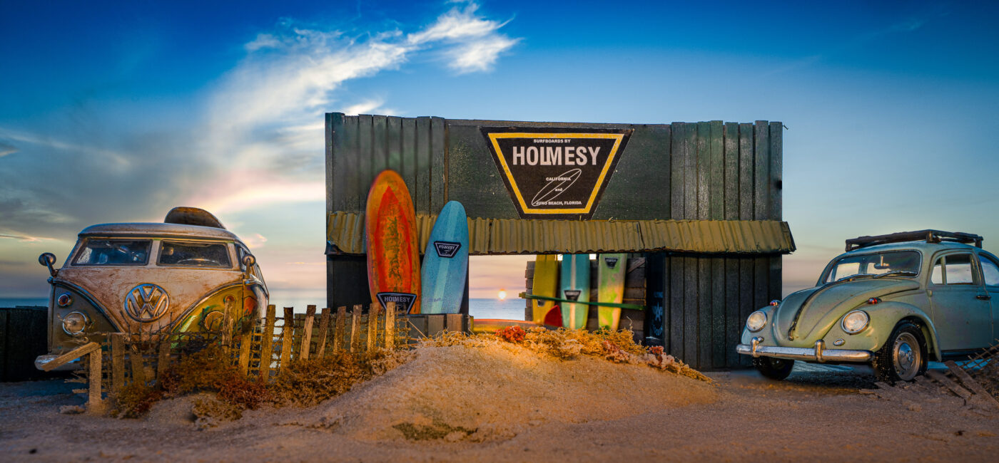 A creative diorama. A few die-cast cars. An easily transportable stand made of PVC. A camera and a tripod. These are the elements used in my “time travel images” The most important consideration is time of day for dramatic lighting. In this demonstration, you can see that the afternoon test shot is no match for the sunrise image taken the next morning. Shooting into the sun requires balancing the foreground subjects with supplemental lighting. A handheld flashlight works fine. Obtaining sharp focus from foreground to horizon is the tricky part and requires a technique called “focus stacking” which means combining multiple images in Adobe Lightroom and Photoshop. Here are the test shots and my final images. Simple diorama made with art board and balsa strips. The awning is a pice of cardboard box with aluminum foil pressed into the grooves. The surfboards are balsa wood. Everything gets a coat of hardware store spray paint. The afternoon test shot shows lots of room for improvement. The lighting is flat. The background is boring–no great clouds. The positioning of the cars is awkward. The viewer sees the unnatural edge of the buildings “floor” in both foreground and background. The golden light of sunrise is a big improvement. Shadows and beams of low light create great mood and texture on the sand dunes, the wood slats and the rust painted on the cars. The small walls, the dunes and the cars hide the transition from the flat surfaced diorama to the beach. This was the final layout of the morning, when the sun became too bright to shoot into. (This happens minutes after sunrise, so you have to move quickly)One technique for dealing with direct sun is to “hide” it partially behind an object and shoot at the cameras highest F-stop. This creates the “sunburst” effect. My favorite image of the day came at the exact moment of sunrise. This requires getting to the location and setting up in the dark, guessing where the sun will appear, and making quick last minute camera and stand adjustments. Most of all, the challenge is balancing light. I took five shots in succession while moving the flashlight over the areas that I wanted to highlight. The final combined image was brushed a bit in Adobe Lightroom. Luck always plays a part. On this day, the clouds appeared where I wanted them. The orange colored horizon was the result of “Saharan” dust in the atmosphere that blew from Africa all the way to Florida!Your time investment in building a diorama can be leveraged to other pictures. With just a change of signs and a few props, the “surfing diorama” becomes the “dixie gas station” or the “Key West boathouse”, etc.